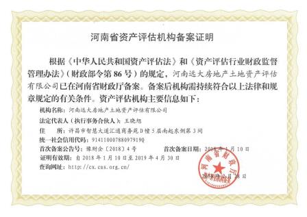 日前,我公司已取得河南省住建厅颁发的房地产估价机构备案证书、河南省国土资源厅出具的土地估价机构备案函和河南省财政厅出具的资产评估机构备案证明,成为区域评估机构唯一一家同时具备房地产估价、土地估价、资产评估三个评估资格的综合评估机构。